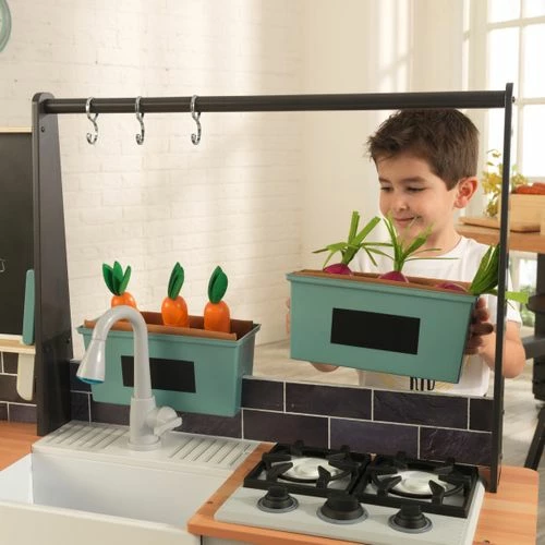 Inspire delicious fun for little foodies with the trendsetting KidKraft Farm to Table Play Kitchen with EZ Kraft Assembly! Kids can show off their green thumbs as they tend to the adorable window box with planted carrot