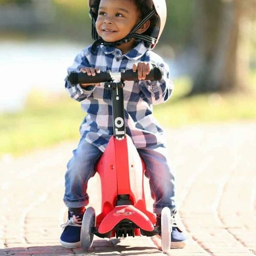 Once your child is ready to scoot, remove the seat and the Mini2Go Deluxe converts to a stand-on scooter with adjustable handlebar.