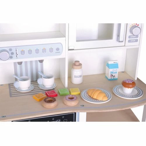Features a microwave with a door that opens and turning dial, a barista coffee maker with turning function selector, blackboard menu and shelves for displaying your cafe goodies. One shelf is angled – just like real bakery display. Also includes wooden cups, plates, cutlery and cafe food. Menu chalkboard is finished in chalk-friendly paint.